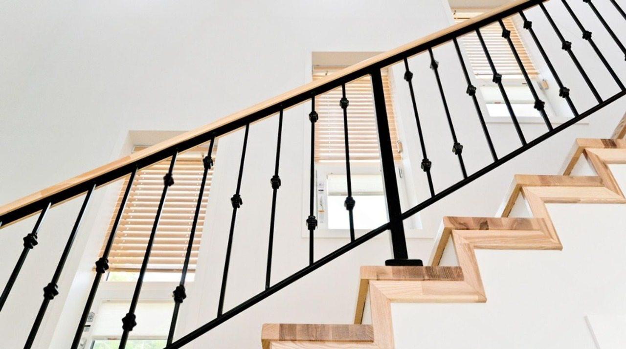 Для облицовки ступеней был выбран массив бука — прочный, проверенный временем, материал. Чтобы конструкция не выглядела громоздкой, подступенки и внешняя боковая часть марша были оштукатурены и окрашены в светлый оттенок. Элегантное ограждение выполнено из тонких кованых прутьев черного цвета, а завершает композицию удобный поручень из бука. Особый характер лестнице придает боковая декоративная обшивка, которая точно повторяет геометрию ступеней, создавая выразительный ритмичный рисунок.