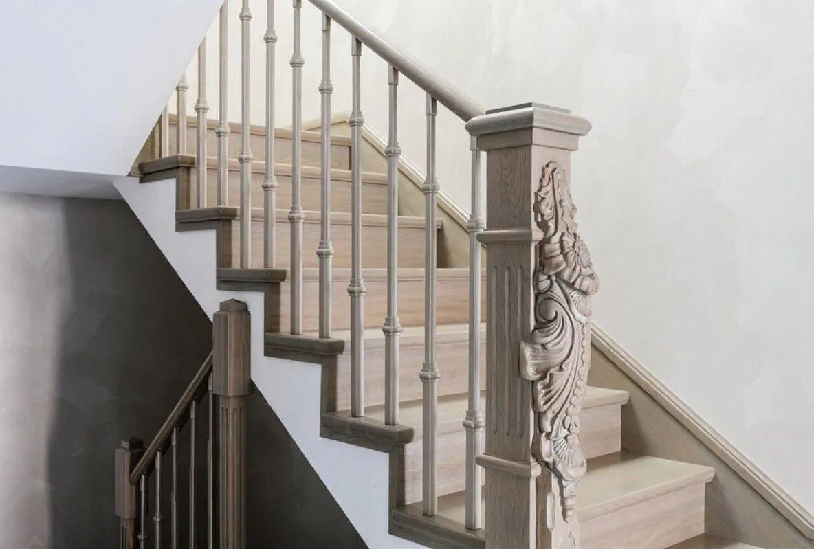 Основой визуальной концепции стал контраст фактур. Теплый, медовый оттенок бука, использованный для ступеней, подступенков и перил, наполняет пространство уютом. Его поддерживают строгие, графичные линии черных кованых балясин, добавляя композиции характера. Массивные опорные столбы из дерева с аккуратной резьбой служат надежными и гармоничными акцентами в начале и конце марша.